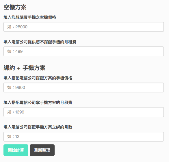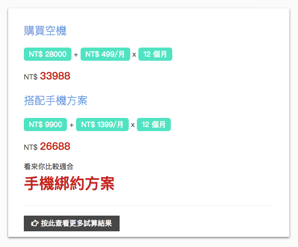 使用者可以填入上方圖所示的各個數值,小工具會透過我們輸入的這幾個值,去計算與判斷我們到底適不適合買空機,或是直接搭配手機綁約的方案。